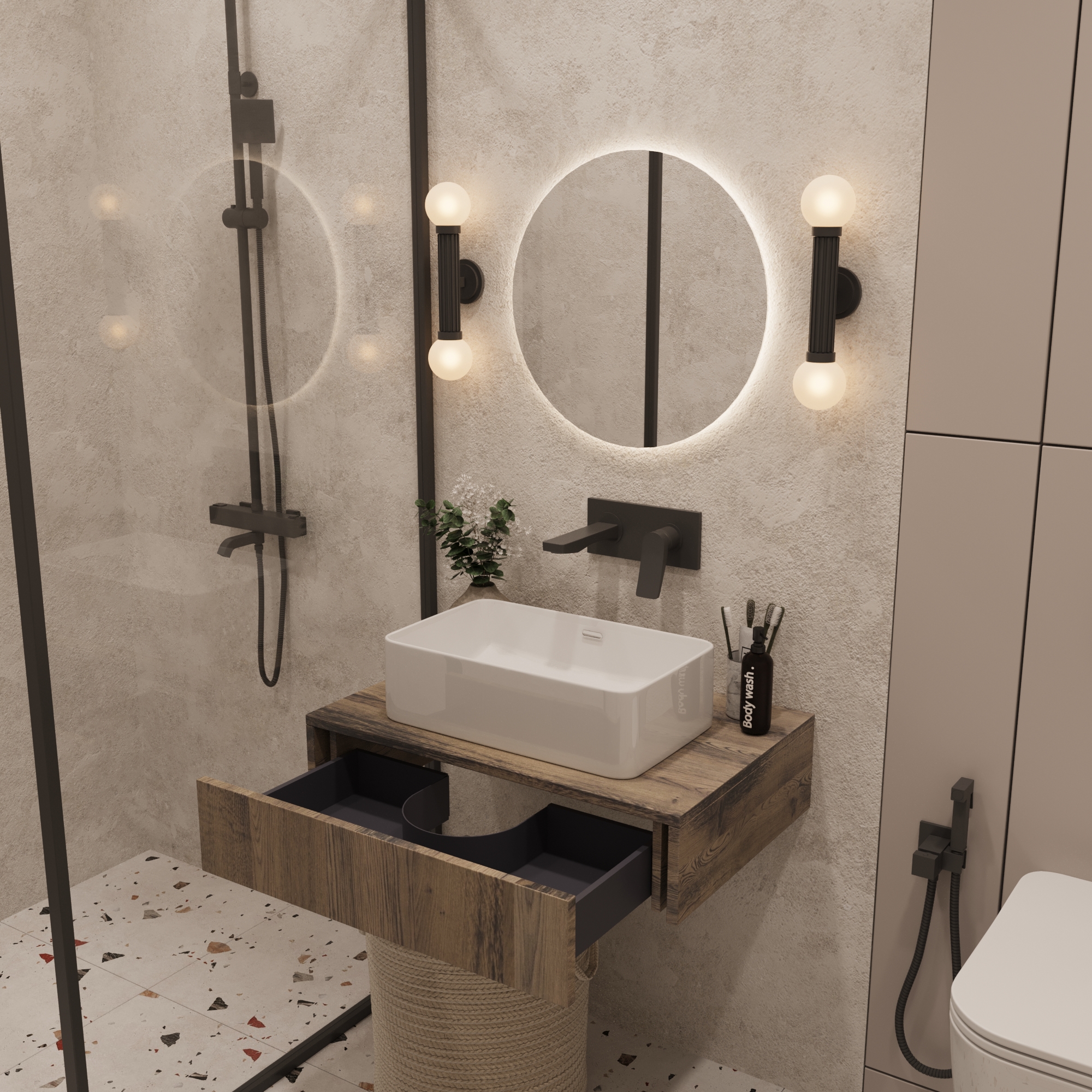 Универсальная столешница выполнена из ЛДСП в цвете Древесина Аттик и не имеет вырезов, что позволяет вам легко выбрать и установить любую раковину и смеситель. Обратите внимание: индивидуальный вырез придётся сделать самостоятельно, что дает вам возможность преобразить пространство под ваши потребности.