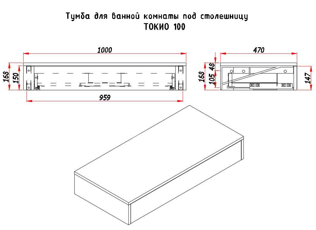 В столешнице отсутствует вырез — его можно сделать самостоятельно, под конкретную модель раковины. Модель крепится к стене на металлические кронштейны.