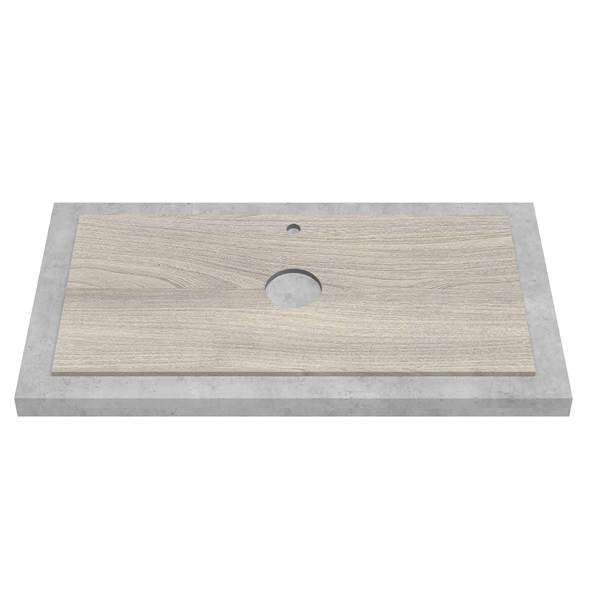 Универсальная столешница выполнена из ЛДСП в цвете Вяз Либерти Серебряный, имеет два выреза, что позволяет легко установить на неё раковину и смеситель.