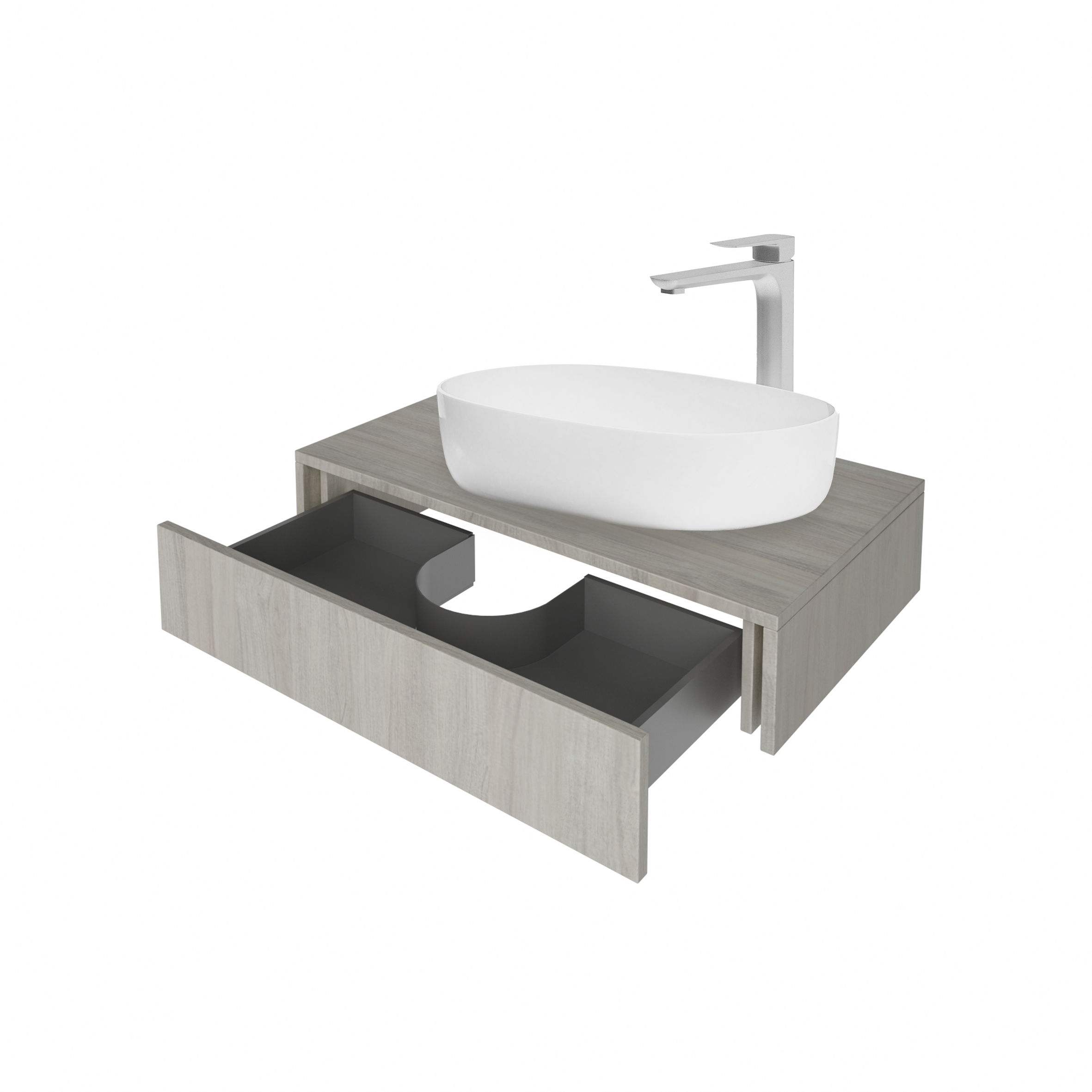 Универсальная столешница выполнена из ЛДСП в цвете Вяз Либерти Серебряный, имеет два выреза, что позволяет легко установить на неё раковину и смеситель.